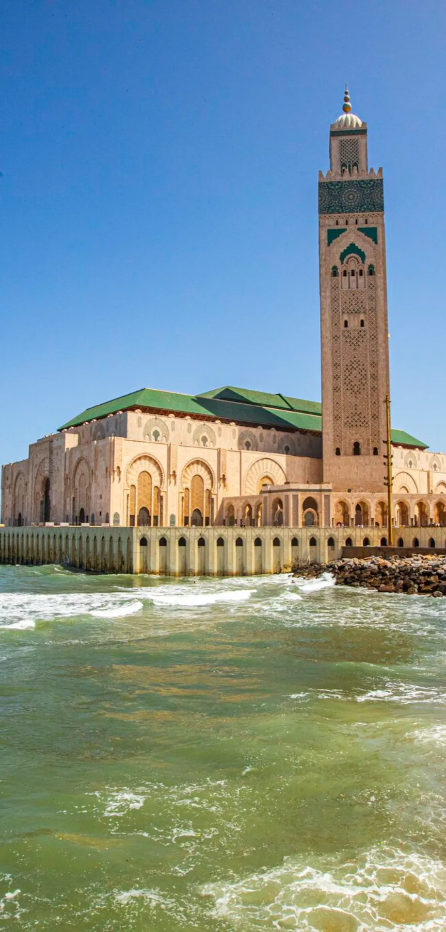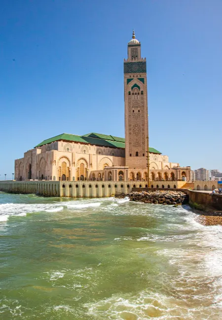 Arquitetura Art Déco e a majestosa Mesquita Hassan II em frente ao mar.